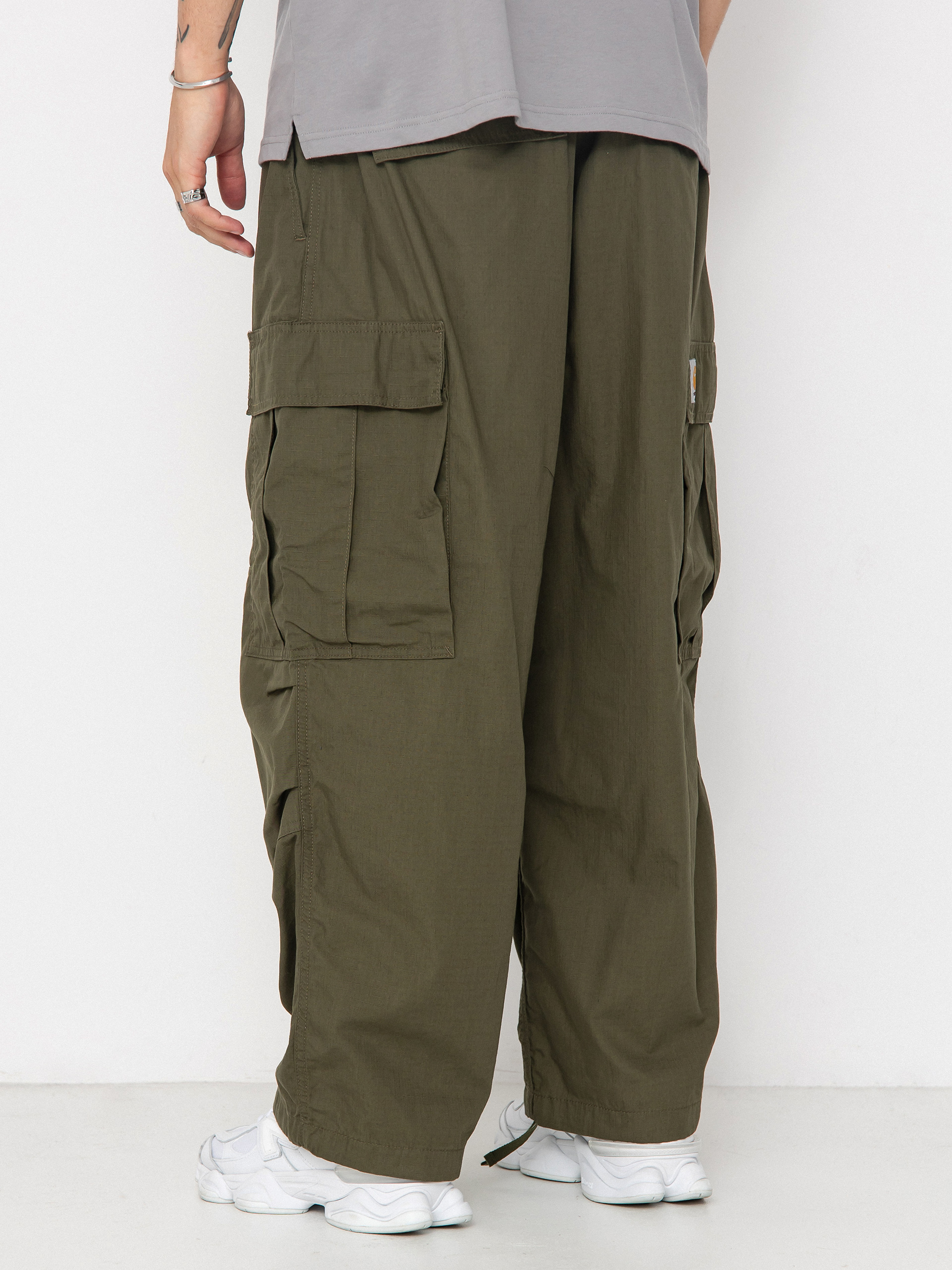 • Pantalonii Jet Cargo sunt realizați din țesătură ripstop din bumbac. Inspirat de stilul militar, stilul cropped are o croială extrem de largă, cu o talie regulată. Genunchii plisați în două straturi oferă un volum suplimentar. Pantalonii au, de asemenea, o talie elastică și deschizături pentru picioare pentru o potrivire croită. Pantalonii au două buzunare laterale, două buzunare la spate și un buzunar cargo pe fiecare picior. Eticheta Square țesută completează designul.