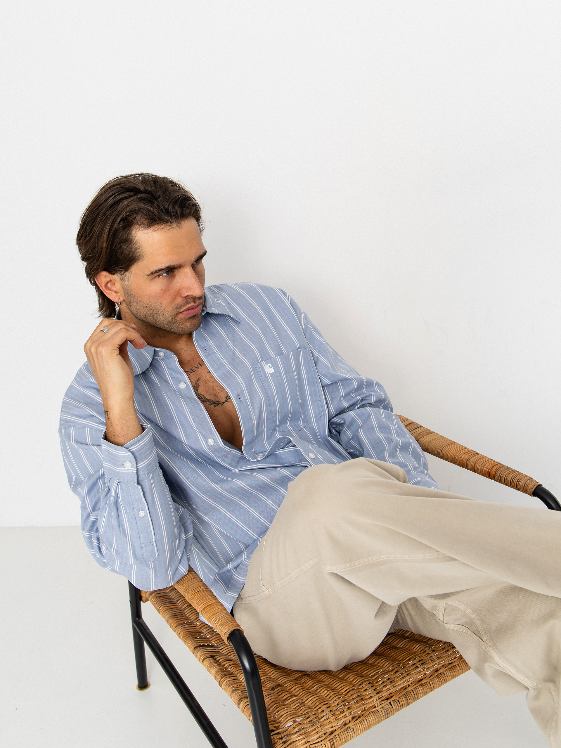 • Carhartt WIP Beale este o piesă ușoară, aerisită, cu o croială relaxată, ideală pentru hainele de lucru de zi cu zi și stilul streetwear. Confecționată din țesătură de bumbac dobby cu o textură tactilă și texturată, are un model subtil cu dungi care adaugă caracter și calitate artizanală. tivul larg asigură libertate de mișcare și confort, în timp ce gulerul clasic și designul cu mânecă lungă fac cămașa potrivită atât pentru ținutele casual, cât și pentru cele mai rafinate. Pe piept există un buzunar cu un logo „C” brodat, careóre un accent minimalist, recognoscibil Carhartt WIP.