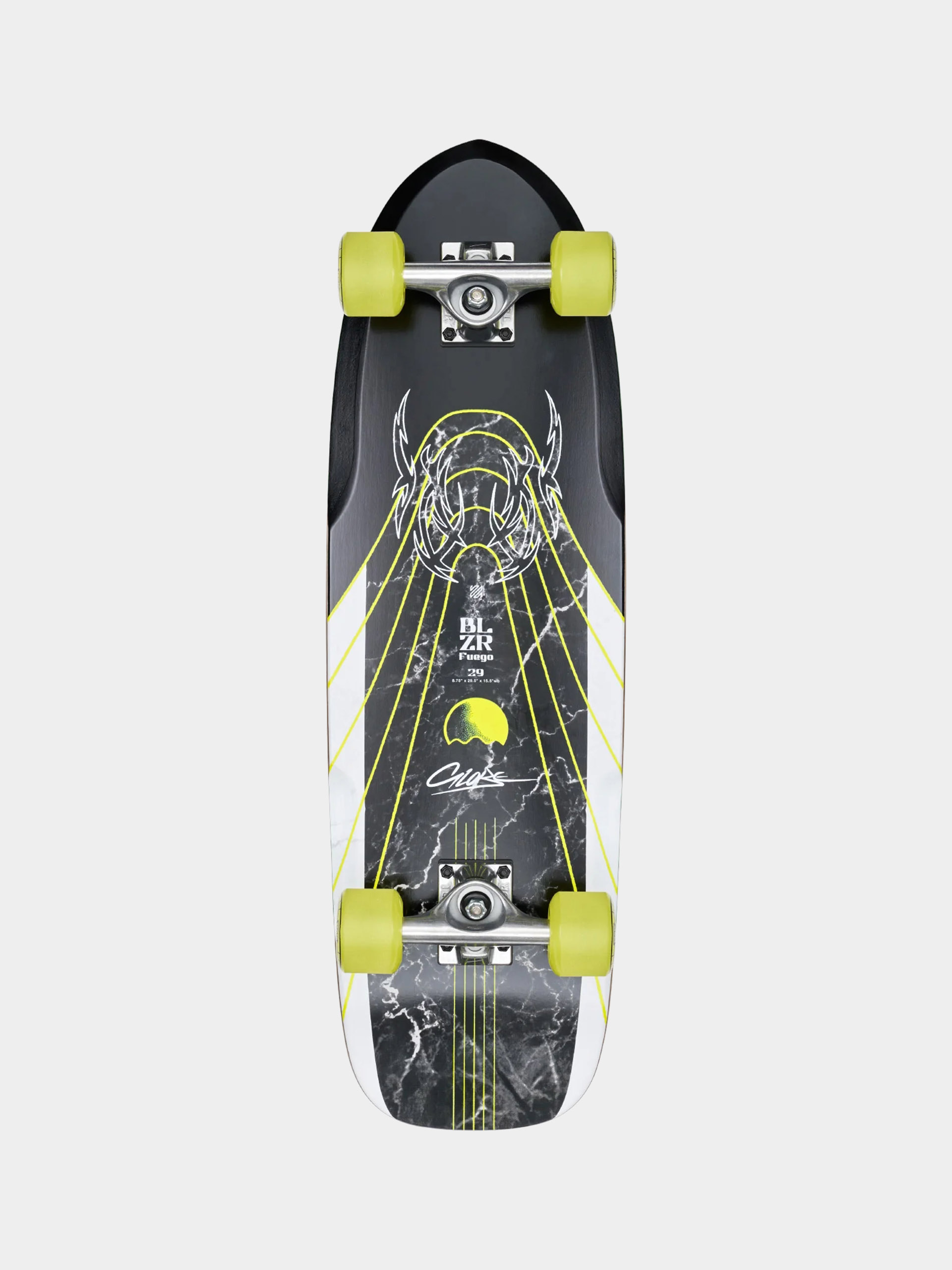 • Globe Blazer Fuego este un cruiser compact de 29 inch proiectat pentru o rulare rapidă și lină în oraș. Construcția Resin-7 rigidă, dar ușoară, oferă durabilitate și o săritură bună, în timp ce amortizarea moale 78A Dozer asigură o rulare lină peste denivelăriós. Puntea scurtă și lată cu concavitate joasă oferă stabilitate, iar kicktail-ul permite un control deplin pentru urcări pe borduri și trucuri mici. Aceasta este alegerea perfectă pentru persoaneleór care caută o placă la îndemână, fiabilă pentru plimbarea de zi cu ziórs și carving.